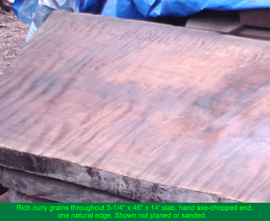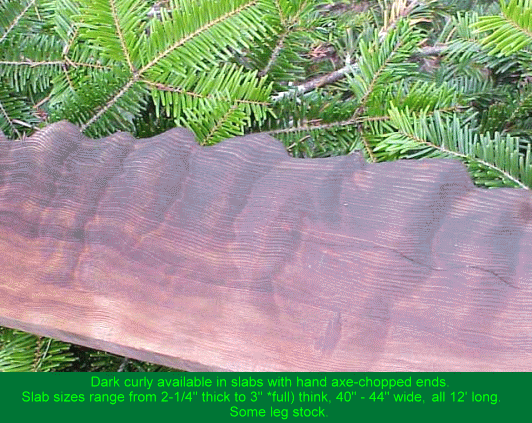 All figured tabletops, live and straight-edge. One of a kind. We also have both lightdark, and ribbon curly grains on slabs and leg stock available in this rare and exotic wood.